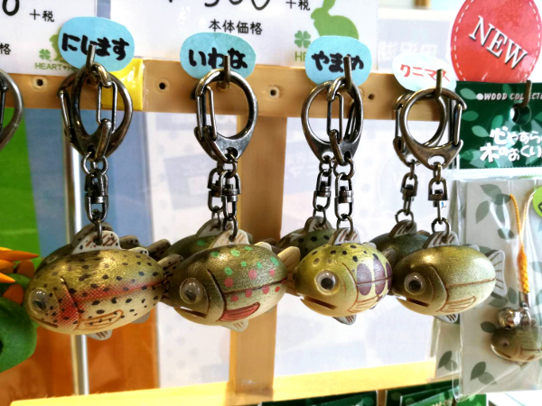 ひとまわり小さなサイズのクニマス根付(500円税別)や
